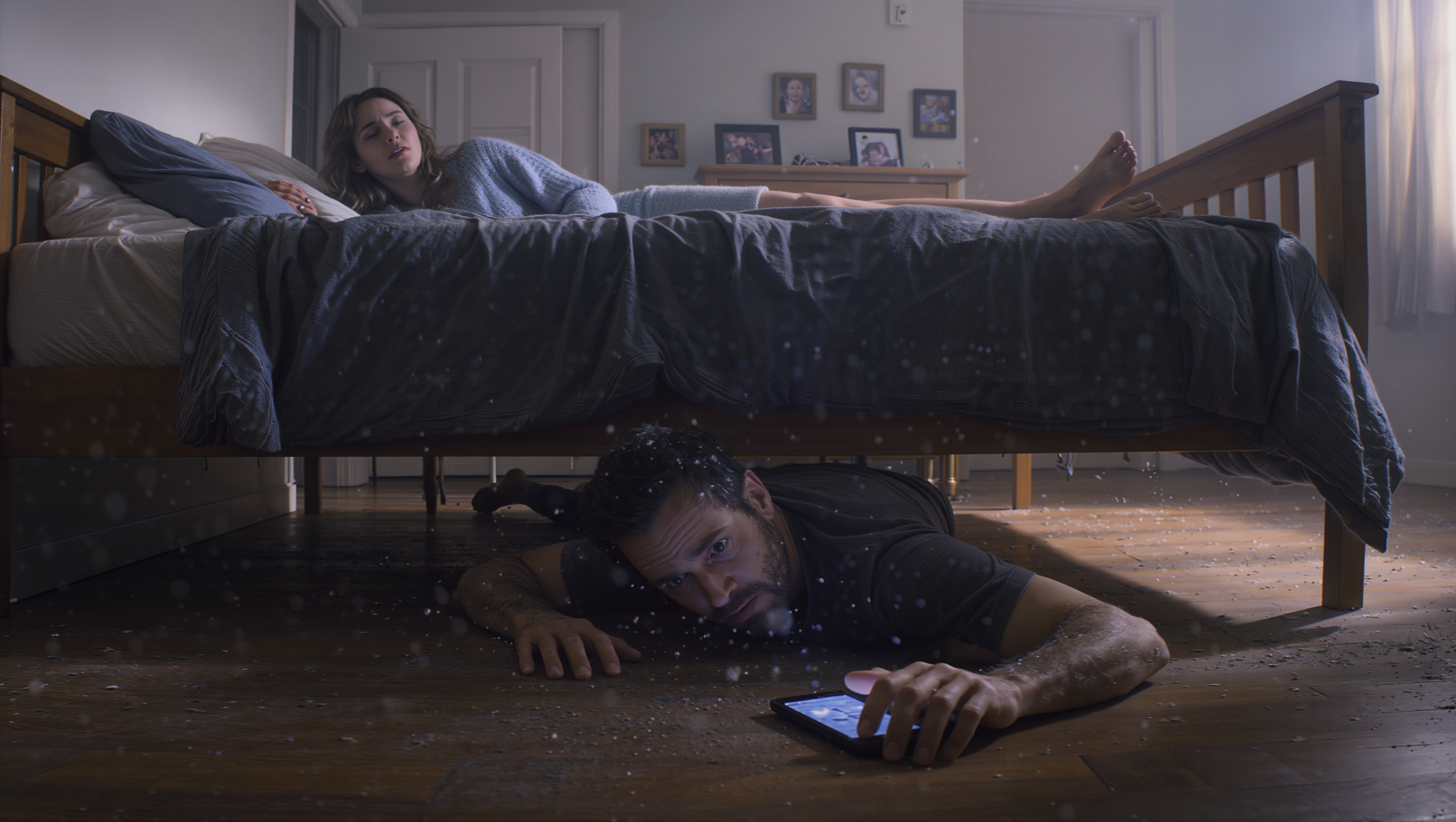 I went straight to the bedroom and slid under the bed. My phone was clutched in my hand, my breath was shallow, and dust was tickling my nose.