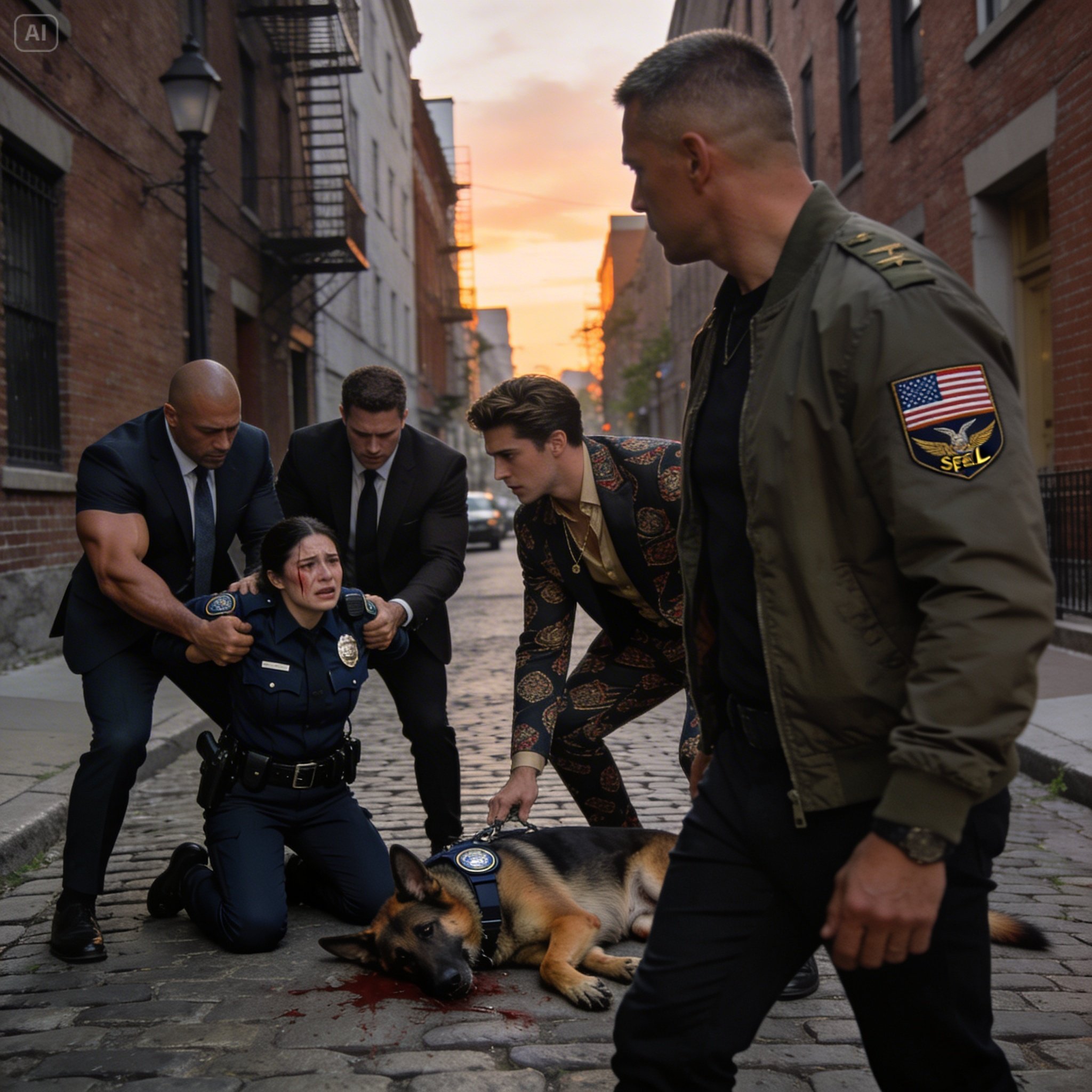 A dark cobblestone street, a desperate officer pinned by tailored thugs, and a defenseless K9 at the mercy of a billionaire's son—until a quiet Navy SEAL steps from the shadows to ask one final question... who will pay next?
