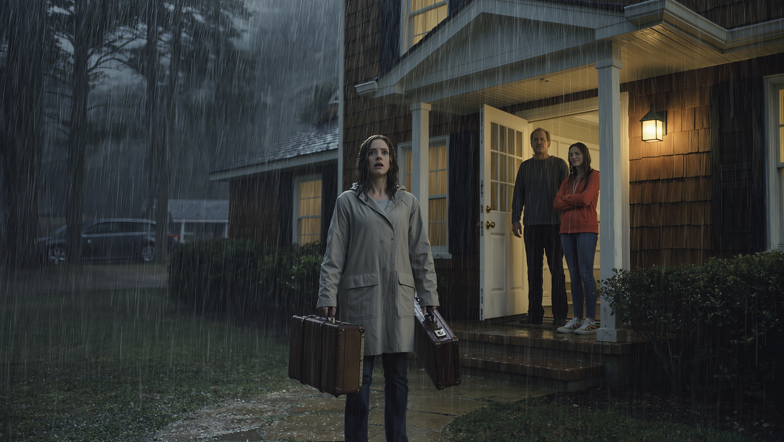 The porch was a sheet of cold rain. The door slammed, and the deadbolt clicked.